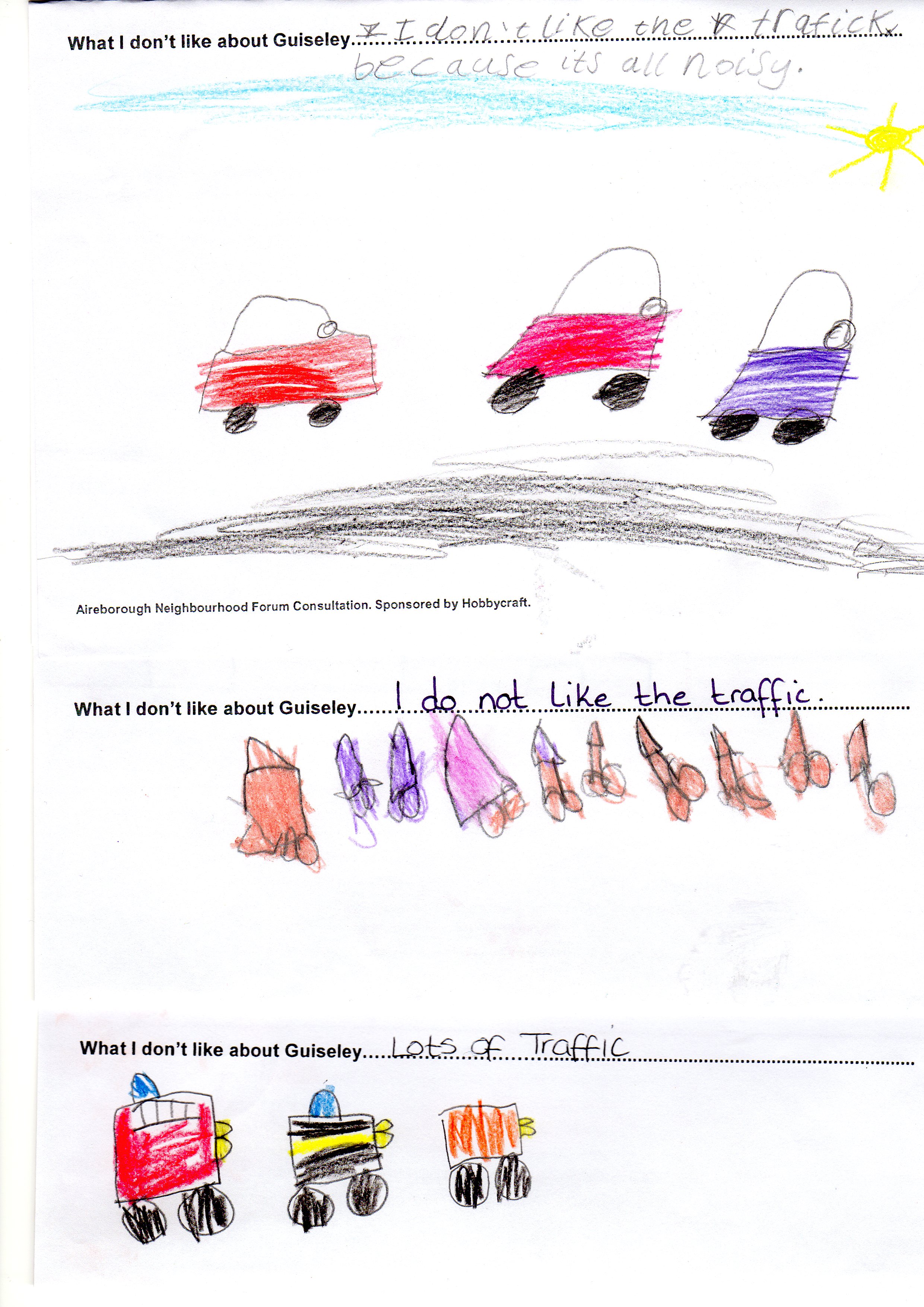 Now, the children of Guiseley Infants have highlighted the noise and general busyness caused by the traffic, as the thing they most dislike about living in Guiseley. In a drawing competitio (,arranged by the Aireborough Neighbourhood Forum and sponsored by Hobbycraft), they did at school in February 2013 about their main like and dislike with Guiseley, traffic, and cars, in one way or another, was the feature they choose to draw the most. There is little doubt that the A65 is seriously affecting the wellbeing of life in the area for everyone, from the youngest to the oldest.
