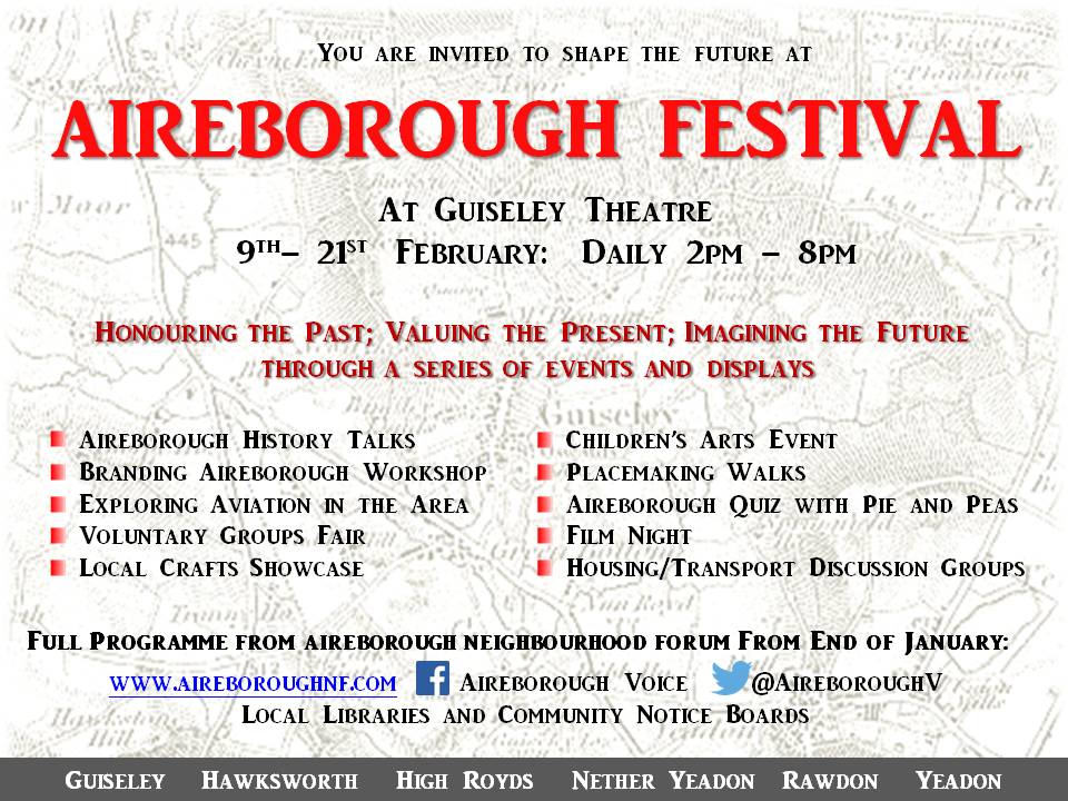 If you would like to take part in the festival in any of the Fairs or Exhibitions, please let us know, we can still add to the programme. The idea is for local people to make it their showcase, for their talents and ideas. As well as for the Aireborough Neighbourhood Development Forum to spread the word about neighbourhood planning and Leeds’ Development Plans, and to listen to what local residents and businesses have to say about designing a thriving place – not becoming a suburban dormitory.