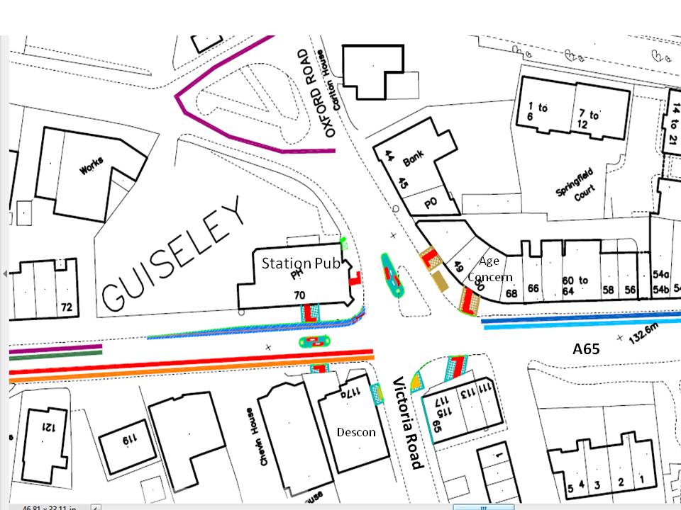 A65: New refuge island to be provided between Station Hotel and Descon (the old Police Station). Footway to be narrowed outside Station Hotel by 1m to accommodate the new refuge, with appropriate widths remaining for carriageway. Traffic can proceed in all directions, but advisory signage will be erected to advise drivers of HGVs to not turn left into Oxford Road and to proceed to the gyratory and come back to the junction. The left turn is too tight as they cannot swing appropriate. Surveys have shown that the number of HGVs (these being articulated vehicles mainly, rather than smaller delivery vans) is low and will not unduly impact upon the traffic flow in Guiseley. The refuge will have formal red/green men phases for pedestrians. The phase between the Station Pub and the refuge will be green when the A65 is on red. The phase between refuge and Descon will be green when Victoria Road is a green light for traffic, as described.