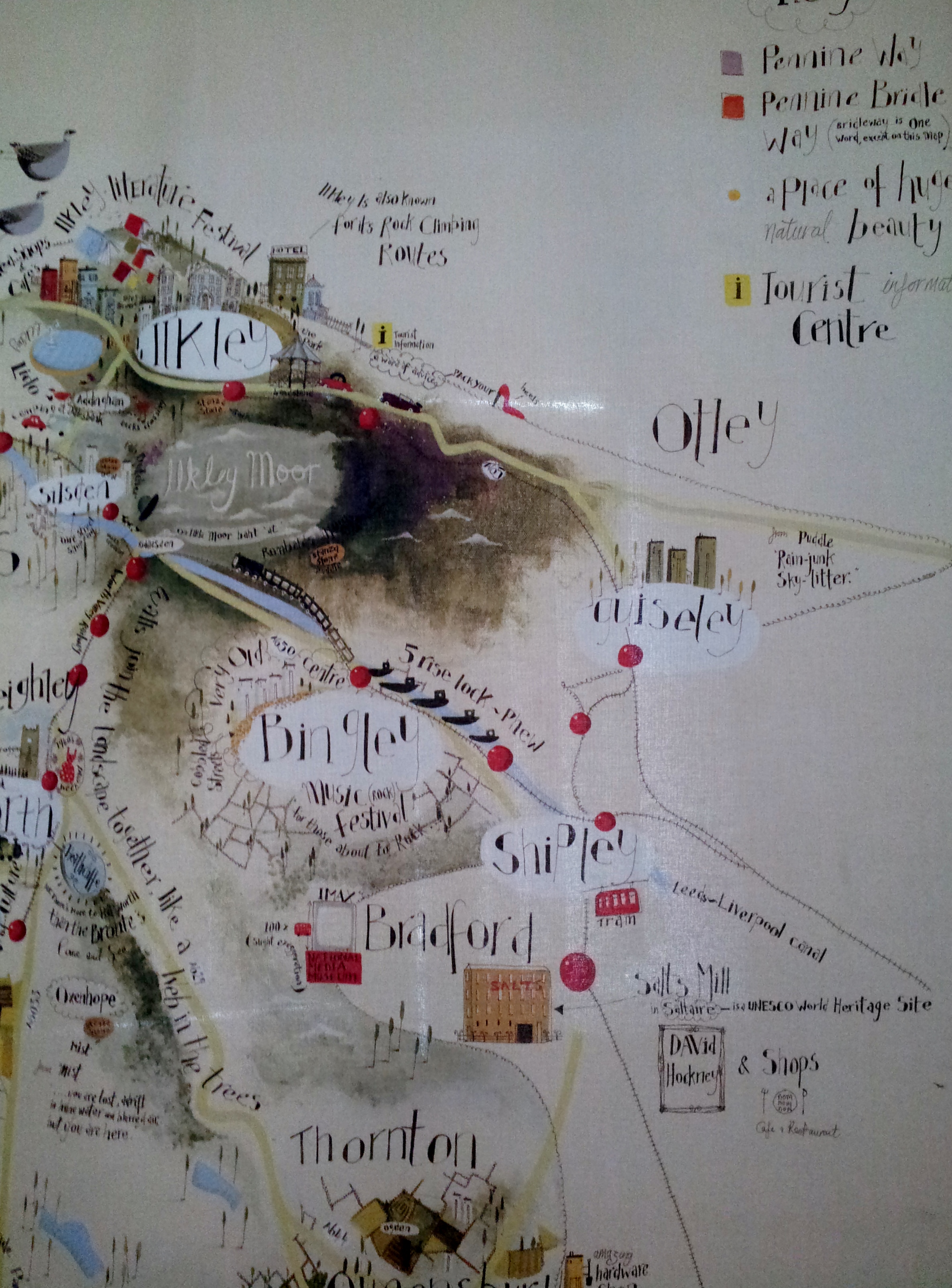 Aireborough is not ‘nowhere’, it is ‘somewhere’ – and we want to capture its distinctiveness on a map. If Bradshaw were to write his railway guide today, what would he say on a visit here? We have taken inspiration from the much admired map of the South Pennines, produced in the last few years, for similar reasons, and local designer Briony Sloan is putting pen to paper to translate ideas into reality.