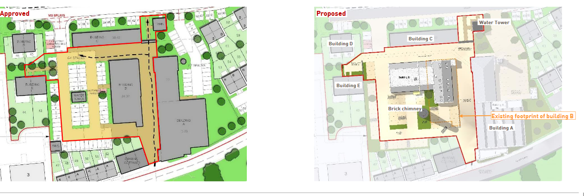 The application’s Design and Access Statement provides much detailed information, including diagrams and photographs, and the Statement can be accessed here. The Statement also asserts that Building B’s extension will be in keeping with the original structure and be constructed using reclaimed stone. The water tower will be relocated and rebuilt using like for like existing materials.