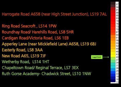 The results are “extremely worrying”. Of the ten test sites in Leeds the most polluted was the A658 in Yeadon at over twice the legal limit of 40 micrograms of nitrogen dioxide per cubic metre of air per day. The two other sites in Aireborough, one on the A65 near Kirk Lane and the other in Little London, Rawdon were also over the legal limit.