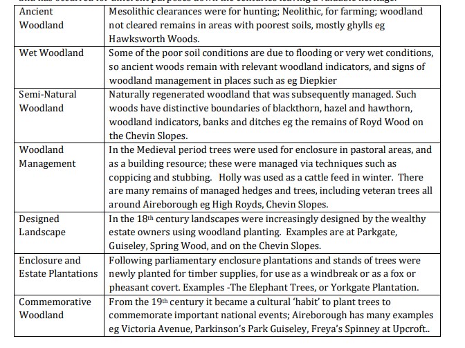 Aireborough has a timeline of woodland types as identified in the West Yorkshire Heritage Landscape Characterisation Report (HLC). Woodland first started to appear post glacial retreat as the climate warmed – alder in the wetter areas, oak, elm and lime on the slopes, and copses of oak, hazel and birch on the hill tops. The trees on the hill tops later turned to peat, giving a valuable resource for fuel and building. Woodland clearance began from the Mesolithic period and has occurred for different purposes down the centuries leaving a valuable heritage.