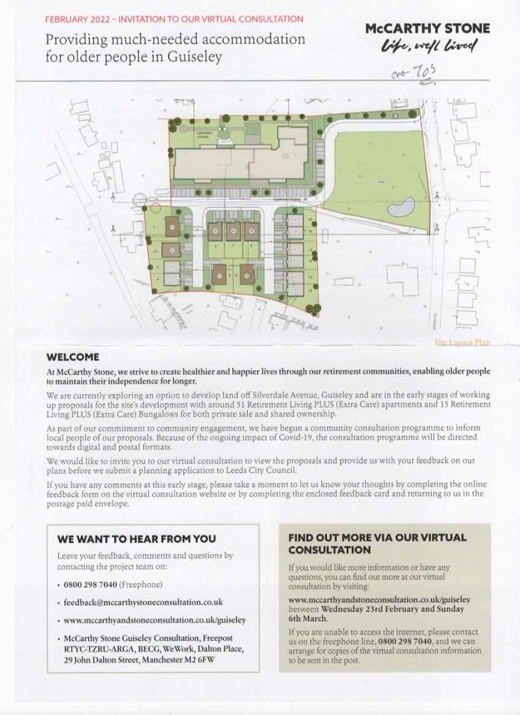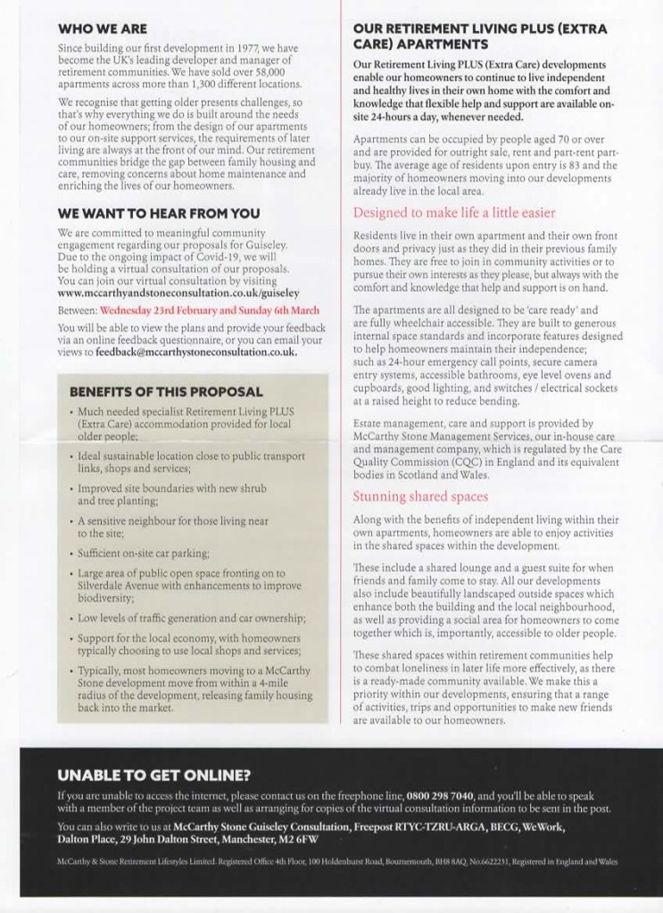 Feedback by Guiseley residents is invited on this McCarthy Stone website by Sunday 6th March 2022. You could also copy key comments to the local Councillors for Guiseley and Rawdon, Graham.Latty@leeds.gov.uk, Paul.Alderson@leeds.gov.uk, Paul.Wadsworth@leeds.gov.uk, and indeed ourselves if you wish aireboroughnp@gmail.com, and Silverdale Action Group silverdale.ag@gmail.com so that we all know people’s thoughts.