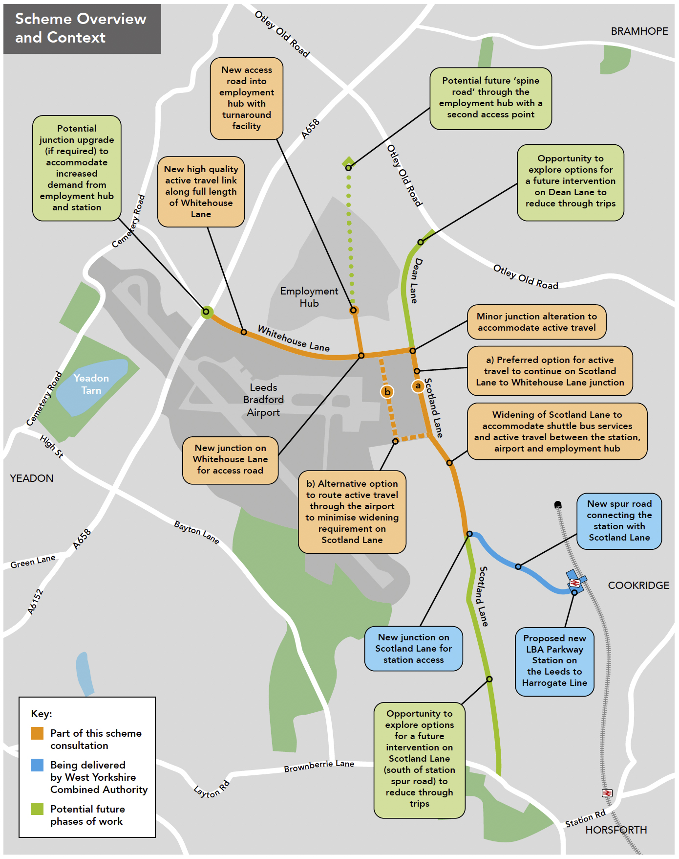 Consultation on proposals for a new transport system around Leeds Bradford Airport particularly on the east side around Scotland Lane and Whitehouse Lane; this includes the route to the proposed “parkway” station located just before the Bramhope rail tunnel.
