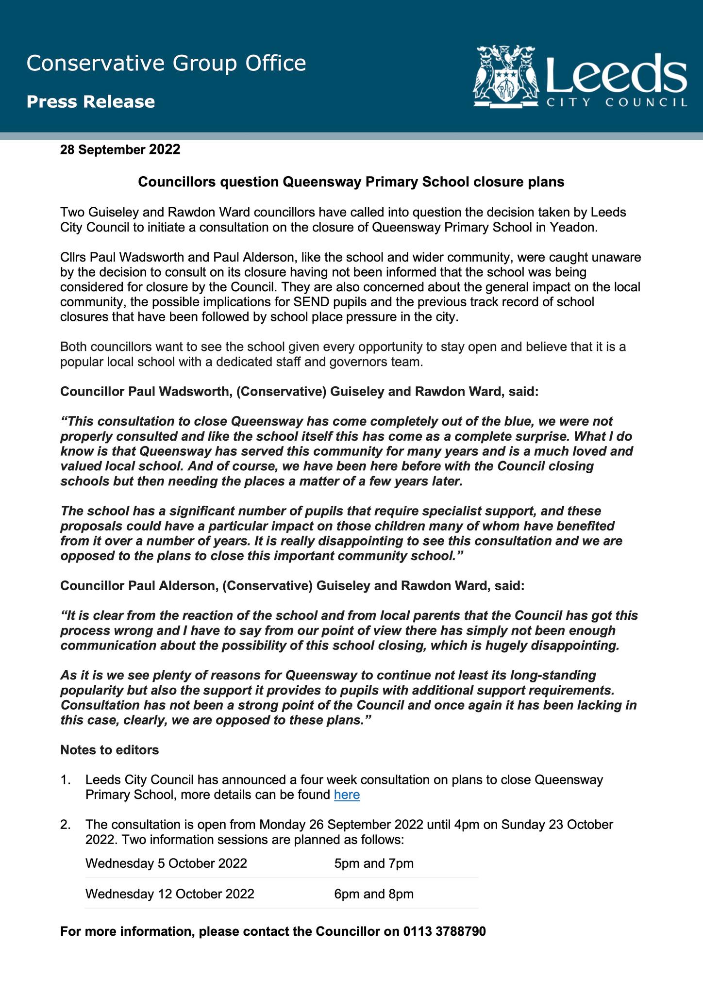 amazing support!”One mistake was not to consult with ward councillors before the decision to consult on closure was made; they all relate receiving emails “out of the blue” on the matter. They also received a late ‘after thought’ invitation to a meeting with Aireborough schools convened by Alex Sobel MP on 31st October, resulting in some being unable to attend. Meanwhile, there is vociferous criticism from the Executive that ward councillors did not ‘go to them’: however, that is not normal practice, ward councillors discuss matters with Officers responsible, as they did on this occasion. Subsequently they then requested a special meeting of the Outer North West Community Committee to discuss Queensway on 19th October which Cllr Pryor did attended. Throughout this whole process there appears to have been miscommunication; a situation that needs rectifying if the public is to be properly represented by ALL the councillors they elect. Discriminatory involvement based on party politics is not an acceptable way to run democracy.