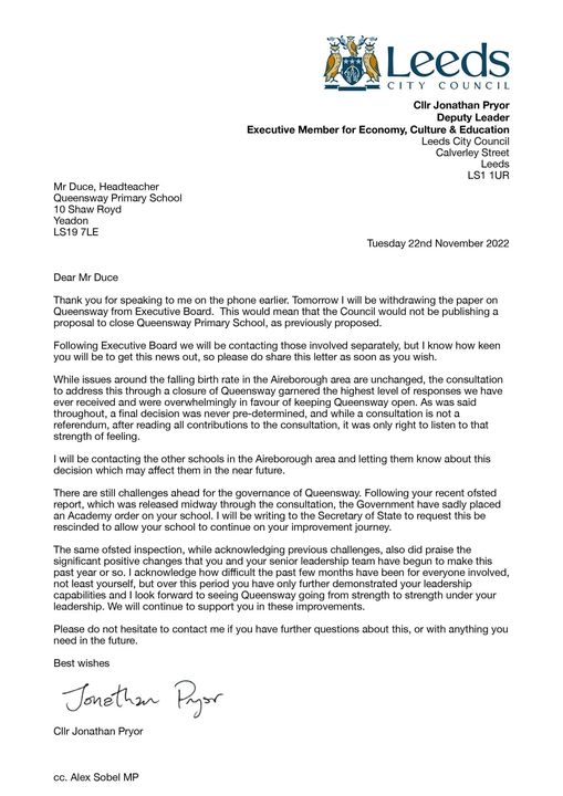 On Wednesday the 23 November Cllr James Lewis, Leader of Leeds City Council, officially announced at Executive Board the withdrawal of the council paper on the closure of Queensway School, adding that “recommendations in it were no longer going forward”. (There is a video of the meeting here, go to 41mins.)
