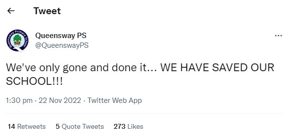 One of the lead campaigners ,Vikki Lancaster, took to social media to thank everyone who has helped, from Governors to “the businesses that put up our poster’s & donated to our fundraising cause…THANKYOU. The people who wrote in to appeal to the council, the people who signed our petition, came to our consultation evenings, our Protests THANKYOU. The supportive councillor whom have given their time, continued support & whom spoke up for us when it really mattered! Thankyou we will forever be grateful! Queensway Primary School